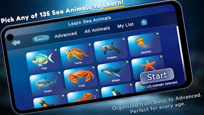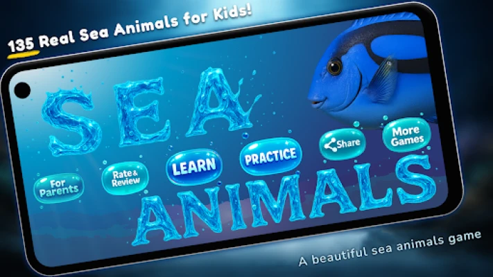 Welcome to the vibrant underwater world of 100 Sea Animals for Kids, an interactive educational game designed for children aged 1 to 13. This innovative app teaches kids the names of 100 real sea creatures through stunning photorealistic images, clear audio pronunciations, and a simple learn-then-practice method that ensures knowledge retention.