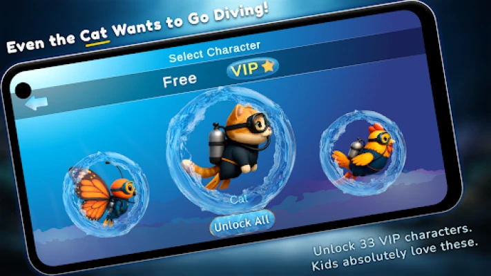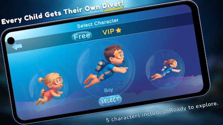 Before each session, children select a scuba diver companion who swims alongside them throughout the game. Five characters are available at no cost: Toddler Boy, Toddler Girl, Boy, Girl, and Ocean Explorer. VIP members can unlock an additional 33 characters, including a Lion, Tiger, T-Rex, Panda, Giraffe, Elephant, Kangaroo, and many more.