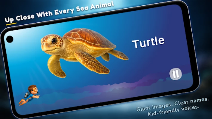 In Learn Mode, children are greeted by a parade of giant sea animals swimming across the screen, each displayed at 2x to 3x their actual size. This immersive experience allows every fin, scale, and detail to be easily observed. As each animal appears, a warm, friendly voice announces its name, making learning engaging and enjoyable. Children can tap on any animal mid-swim to trigger a delightful burst of ocean bubbles, hear the name again, and even learn its spelling or a fun fact. Thereās no pressure or timerājust a serene environment for exploration.