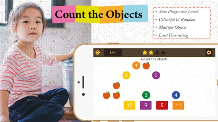 This activity resembles a quiz, targeting children who have a basic understanding of numbers and their shapes. A random number of objects appears on the screen, accompanied by multiple-choice options. Children tap the correct answer, with the difficulty level increasing as they progress. This activity is specifically designed for children aged 3 to 5 years, reinforcing their counting skills.