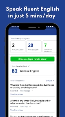 Imagine having a personal English teacher available at your fingertips. With 5-Minute English, you receive real-time, AI-powered corrections that guide you through your speaking practice. This feature allows you to learn from your mistakes instantly, ensuring that you develop accurate pronunciation and grammar skills as you practice.