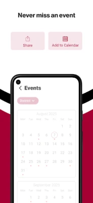 The events section serves as a comprehensive calendar for all happenings within the district. With just a single tap, users can effortlessly add events to their personal calendars, ensuring they stay organized and informed. Additionally, sharing these events with friends and family is a breeze, making it easier to coordinate attendance and participation.