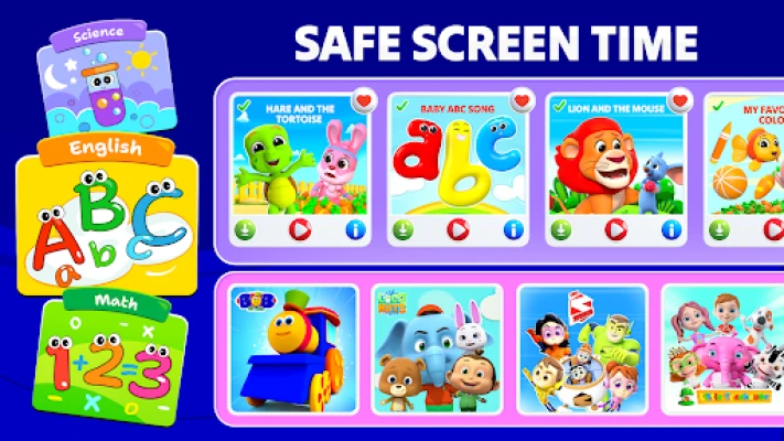 The Learning Steps feature provides a structured learning path for your child, while the Play and Learn section of the Apples and Bananas app opens the door to endless fun through play. Children can explore a variety of engaging categories, including numbers, colors, vehicles, animals, songs, stories, and games, making education both enjoyable and effective. Best of all, there are no in-app ads to disrupt the learning experience.