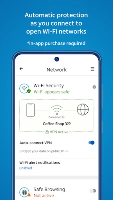 Protect your data on public Wi-Fi networks with a private connection (VPN). This feature is automatically enabled when you connect to an unencrypted public Wi-Fi network, ensuring your information remains secure.