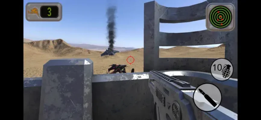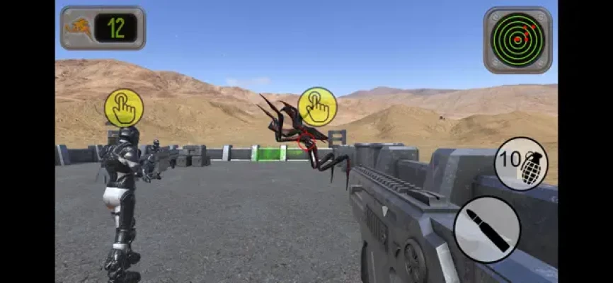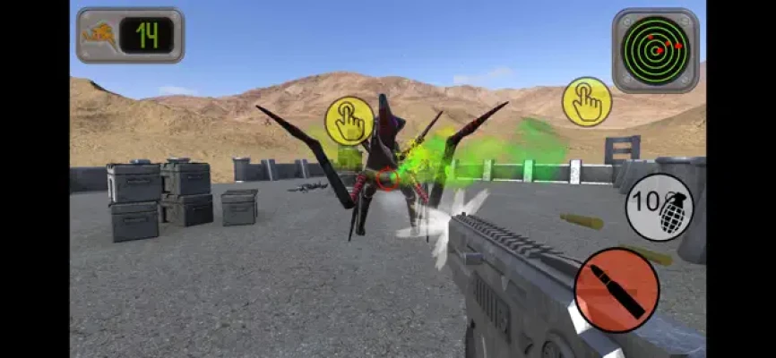 Alien bugs have infested the planet and you are on your own in the desert. Defend yourself against a never ending swarm of them for as long as you can. You have to use your gun and grenades effectively and keep checking around you. The radar at the top of the screen will help you know where the bugs are. You can move to a new position by tapping on it's marker. It is recommended to use the gyroscope but a joystick option is available if you want to use it. To play the game hold your device out in front of you while standing up and turn in a circle to look around. How many bugs can you kill?...