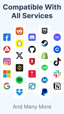 Our app works with a wide range of services, including Google, Microsoft, Facebook, Instagram, Amazon, TikTok, Discord, Twitter, Snapchat, LinkedIn, PayPal, Binance, Coinbase, Kraken, Roblox, Steam, GitHub, GitLab, Slack, Notion, Dropbox, and many more. Any service that supports TOTP-based two-factor authentication is compatible.