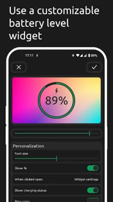 Battery One features a sleek, customizable widget that displays your battery's current charge level. You can resize the widget, adjust its colors, and modify text size to fit your aesthetic preferences. This functionality allows for quick access to vital battery statistics right from your home screen.