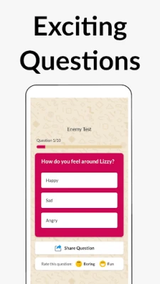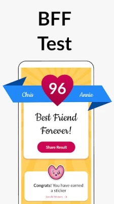 Getting started with the BFF Friendship Test is a breeze. Simply input your name and your friend's name to initiate the friendship compatibility test. The app presents you with a playful quiz consisting of 10 straightforward questions about your friendship. Once you complete the quiz, you’ll receive a friendship score displayed on the buddy meter, giving you insight into your bond.