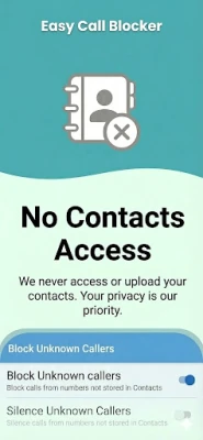 Your privacy is our top priority. Easy Call Blocker never accesses, reads, or uploads your personal contact list. Rest assured that your data remains securely on your device, giving you peace of mind.