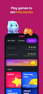 - Oinks Rewards: Accumulate “Oinks” by finishing financial lessons and quizzes, which can be exchanged for real stock rewards.