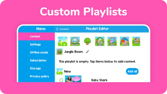 Every child is unique, and so are their preferences. With our app, you can tailor the experience to suit your child’s interests. Create custom playlists and organize the main menu to ensure that only the content you want is accessible. Whether you want to avoid Halloween-themed videos or the Finger Family song, you have complete control over what your child watches.