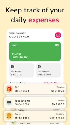 Quickly visualize your daily income and expenses with the calendar view. This feature helps you track your spending habits and income flow at a glance, allowing you to see when and where your money is coming in and going out.