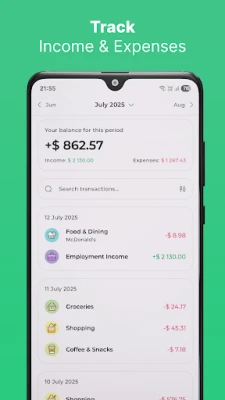 Finding specific transactions is a breeze with the app's smart filters. You can search by wallet, category, type, or keywords, making it easy to view your financial history and identify spending trends. This feature enhances your ability to analyze your finances and adjust your budget accordingly.