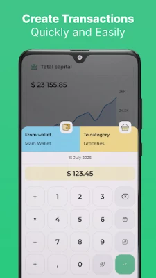 Gain valuable insights into your financial habits with informative charts that break down your income and expenses. The app highlights your top spending categories and provides wallet summaries, allowing you to see where your money goes. With smart calculations of your total personal capital and historical data, you can effectively manage your finances and make informed decisions.