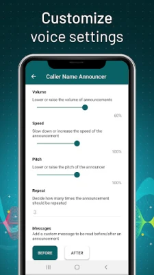 With the Caller Name Announcer App, you can add a personal touch to your incoming call notifications. The advanced name speaker feature allows you to create a custom announcement message that can be played either before or after the caller's name. This personalization enhances your experience, making it more enjoyable and tailored to your preferences.