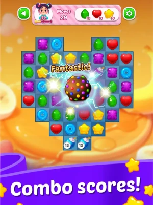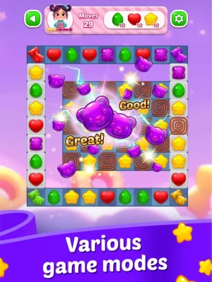 - Engaging Match-3 Gameplay: Swipe and align three or more candies to clear levels and rack up impressive scores!
