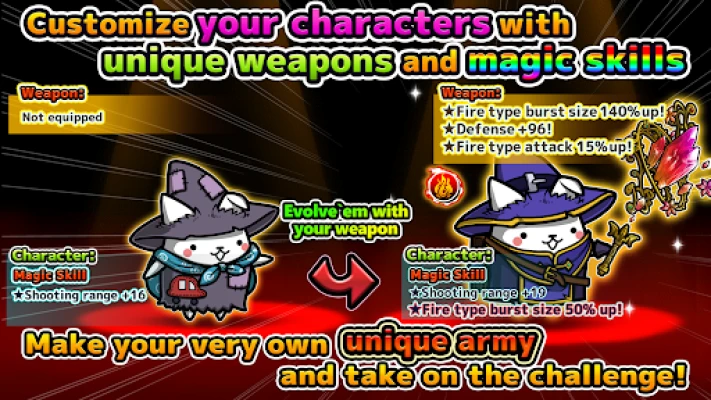 Step into a vibrant world where creativity knows no bounds. In Cats the Commander, players can mix and match their cats with various weapons and magical items collected throughout their journey. The only limit is your imagination! Assemble a fierce feline army, sharpen those claws, and prepare to unleash legendary cat heroes. The adventure is as limitless as your creativity!