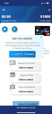 With the CFC Mobile Access app, you can take control of your financial life directly from your smartphone or tablet. Whether you’re at home or on the move, managing your credit card account is simple and efficient. Download the app today to start enjoying these benefits and streamline your financial management.