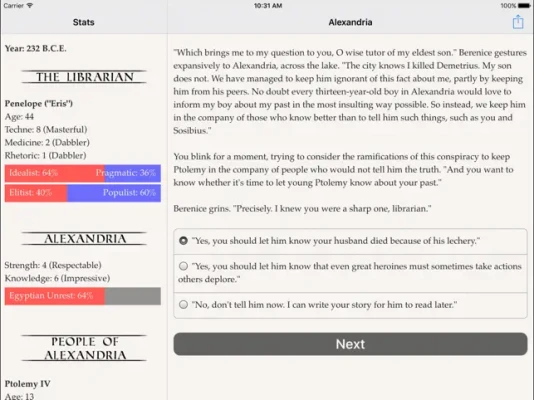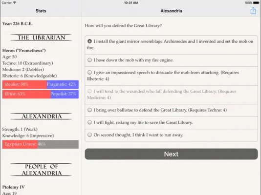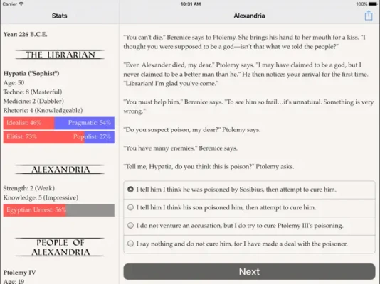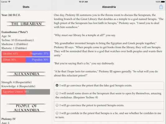 In "Choice of Alexandria," the fate of the city of wonders rests on your shoulders. Will you emerge as a brilliant inventor, a persuasive speaker, or a life-saving doctor? The choices you make will shape not only your destiny but also the legacy of an entire civilization. Dive into this interactive novella and embark on a journey that transcends time, where your imagination knows no bounds.
