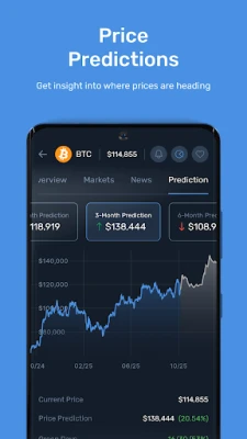 Stay ahead of the market with algorithmically generated short- and long-term price predictions for Bitcoin and virtually every other digital asset. Our predictions leverage technical indicators and historical market data to help you anticipate where your favorite cryptocurrencies might be headed next.