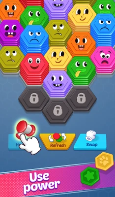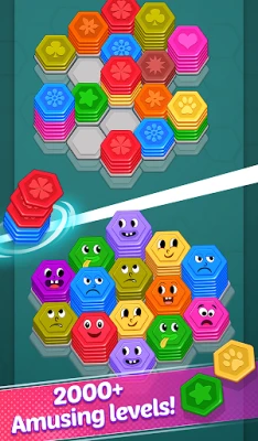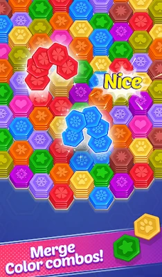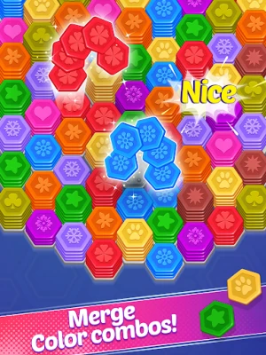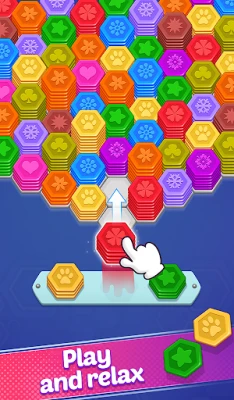 - Merge Colors: The top color of the stack will merge with adjacent hexagons of the same color, creating a satisfying match.
