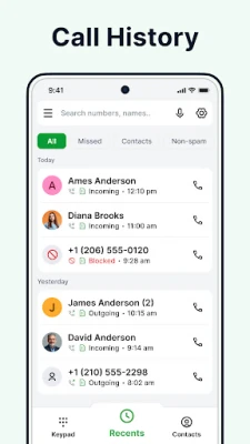 Stay organized with a detailed call history that includes incoming, outgoing, missed, and blocked calls. The app allows you to easily re-dial numbers, delete call logs, or save unknown numbers directly to your contacts. This feature ensures that you never lose track of important calls.