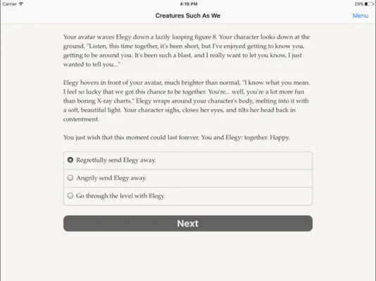 Recognized with Second Place in the prestigious 20th Annual Interactive Fiction Competition (IFComp), Creatures Such as We has garnered acclaim from industry experts: