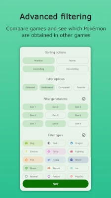 Finding the perfect Pokémon has never been easier. With Dex Tracker, you can utilize advanced filtering and search options to pinpoint the exact monster you need. Whether you want to sort by type, generation, or other criteria, the app streamlines the process, allowing you to focus on what truly matters—building your ultimate team.