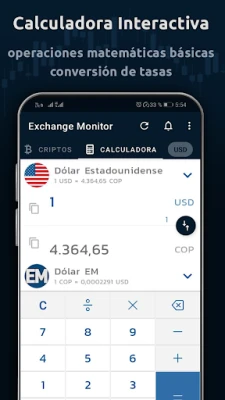 One of the standout features of Dólar TRM Colombia is its excellent currency exchange calculator. This tool enables users to perform quick conversions between dozens of listed rates, currencies, and cryptocurrencies. You can execute simple mathematical operations—addition, subtraction, multiplication, and division—without needing a separate calculator. This efficiency is particularly beneficial for traders and individuals who frequently engage in currency exchanges.