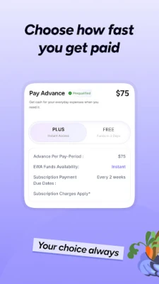 Choose between a free plan that delivers salary advances in 1-3 business days or an optional instant pay plan for a small fee. The instant pay plan allows you to receive funds in minutes, providing you with the flexibility you need.