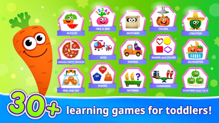 Introducing Super Carrot (S.C.), your child's enthusiastic guide in the world of educational games. S.C. is designed to motivate and inspire young learners, making the app intuitive and easy to navigate. With Super Carrot by their side, children will feel encouraged and supported as they explore various learning activities tailored for kids aged three and up.