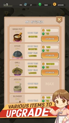 From grilling succulent meats to crafting steaming bowls of soup and crispy Bindaetteok, every dish you prepare is a step towards building your culinary empire. Click on the ingredients to create mouthwatering meals that will satisfy your guests and keep them coming back for more.