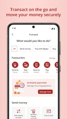 - Send Money: Transfer funds to your own or other Equity accounts, send money to other banks locally or internationally, and even to mobile money services.