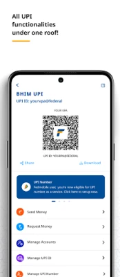 FedMobile integrates all the functionalities of BHIM UPI, enabling users to enjoy a full suite of UPI services. This feature enhances your banking experience by allowing you to make instant payments, request money, and manage your transactions effortlessly.