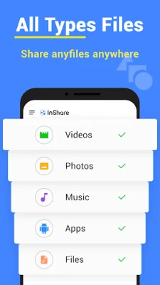 InShare is engineered to meet all your file transfer needs effortlessly. With its intuitive interface, you can select from a variety of file types, including videos, games, photos, music, apps, and PDFs. Once you've made your selection, InShare ensures that your files are shared securely and at lightning speed.