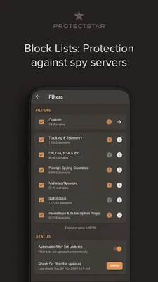 Imagine a firewall that does more than just detect spies; it also protects against hacker attacks from known intelligence services and government organizations. The Protectstar™ no-root firewall AI was specifically developed as a cybersecurity app to block unwanted access from entities like the FBI, CIA, NSA, and others. With its integrated Intrusion Prevention System (IPS), the app automatically blocks known servers and IP addresses associated with these organizations. Additionally, the Wi-Fi blocker protects against known spy servers in countries such as China, Iran, and Russia, as well as against spyware, malware, and mobile trackers.