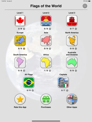 With this app, you can learn about flags from each continent, including Europe, Asia, Africa, and South America. The flags are categorized into three distinct levels: