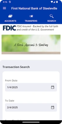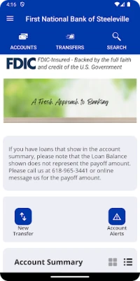FNB of Steeleville Mobile Banking is a secure mobile banking solution. With mobile banking, customers can access the following services from their mobile devices: Account inquiries (checking, savings, certificates of deposit, money markets, mortgage, consumer loans and other accounts), transfer funds between accounts, text banking and mobile alerts, deposit checks, pay mortgage and consumer loans, pay bills, FNB Debit Card activation and deactivation, view check images and account statements, contact customer service, and view branch locations.