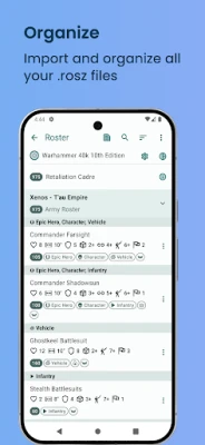 - Smart Organization: Effortlessly categorize your units by battlefield roles and detachments, making it easier to strategize your moves.