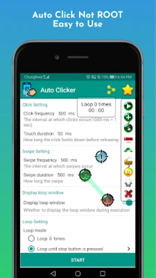The No Root Auto Clicker also features a robust loop mode, allowing users to automate actions continuously. You can set: