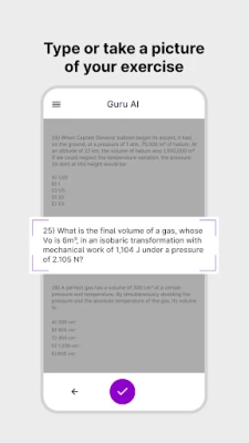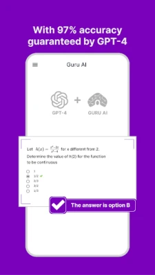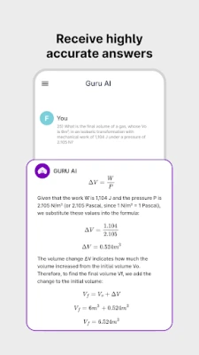 Using Guru AI is a breeze. Simply snap a photo of your question or type it into the app, and within seconds, Guru AI processes the topic to provide you with a complete solution. Each response comes with clear explanations to enhance your learning experience.