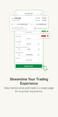 Hang Seng Invest Express offers effortless synchronization of your Watchlist across all Hang Seng platforms. This feature ensures you stay updated on market trends and can make informed trading decisions. With detailed quotes available at a glance, you can search for stocks by number or name and access interactive charts and order searches.