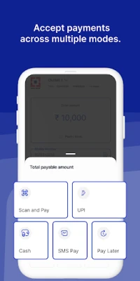 - Multiple Payment Options: Accept payments via UPI, SMS Pay, QR codes, and cards, ensuring flexibility for your customers.