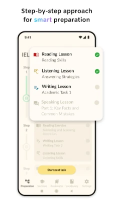 This app employs a distinctive step-by-step learning approach that promotes long-term retention of knowledge. The course is structured into well-organized learning steps, incorporating lessons and exercises designed to revisit material just before you might forget it. This method not only optimizes your study time but also significantly enhances your English language skills, ensuring you are thoroughly prepared for the actual exam.