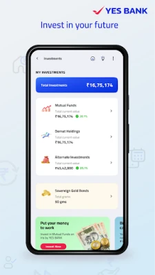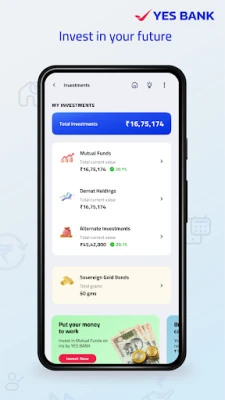 Grow your wealth confidently by exploring a diverse range of investment options. The YES mobile app provides access to a curated list of mutual funds tailored to your financial goals and risk tolerance. Invest online with instant SIPs, save on taxes with ELSS mutual funds, and even invest in digital gold through online sovereign gold bonds.