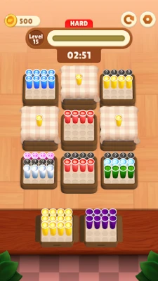 Dive into a playful juice-clearing challenge! Trays filled with colorful juice cups are stacked one above the other; tap to move the cups and sort them to clear the board. Pure challenging puzzle fun. Every level ramps up the challenge with unique layouts and clever stack combinations.