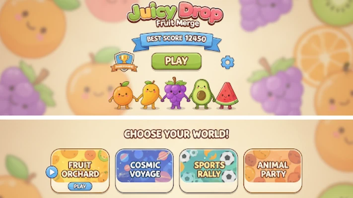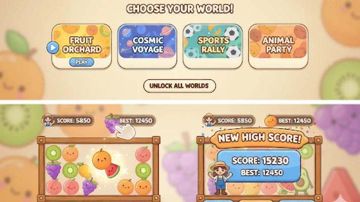 The fun doesn’t end in the orchard! Once you’ve mastered the classic fruit mode, you can unlock and explore three additional captivating worlds, each featuring its own unique set of adorable characters to merge!