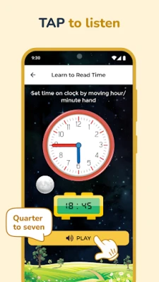 Watch your child transform into a time-telling whiz while having a blast! This clock app features a variety of digital and analog clocks that kids can interact with. The adjustable analog clock allows children to move the hands, set different times, and visualize how various times of the day appear on a clock. This hands-on approach not only makes learning to read a clock enjoyable but also helps children intuitively understand the concept of time.