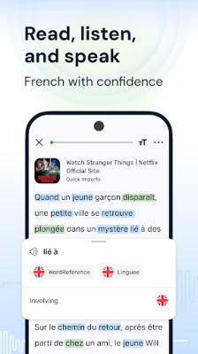 Transform your favorite Netflix shows, YouTube videos, podcasts, books, and web articles into tailored French lessons. With the assistance of AI, you can read, listen, and learn from content that you genuinely enjoy, making the learning process more engaging.