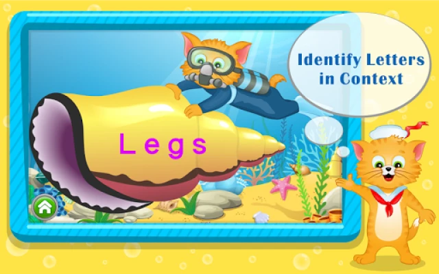 Exploring the deep sea, children search for letter-coins and use them to create segments of four letters in a row, reinforcing their understanding of the alphabet's order.